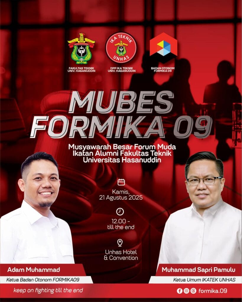 Manyala – Ikatan Alumni Teknik Universitas Hasanuddin (IKA Teknik Unhas) akan menggelar Rapat Koordinasi Nasional (Rakornas) 2025 pada 23-25 Agustus 2025 dan Musyawarah Besar (Mubes) Badan Otonom Forum Alumni Muda IKATEK Unhas (FORMIKA 09) pada 21 Agustus 2025.